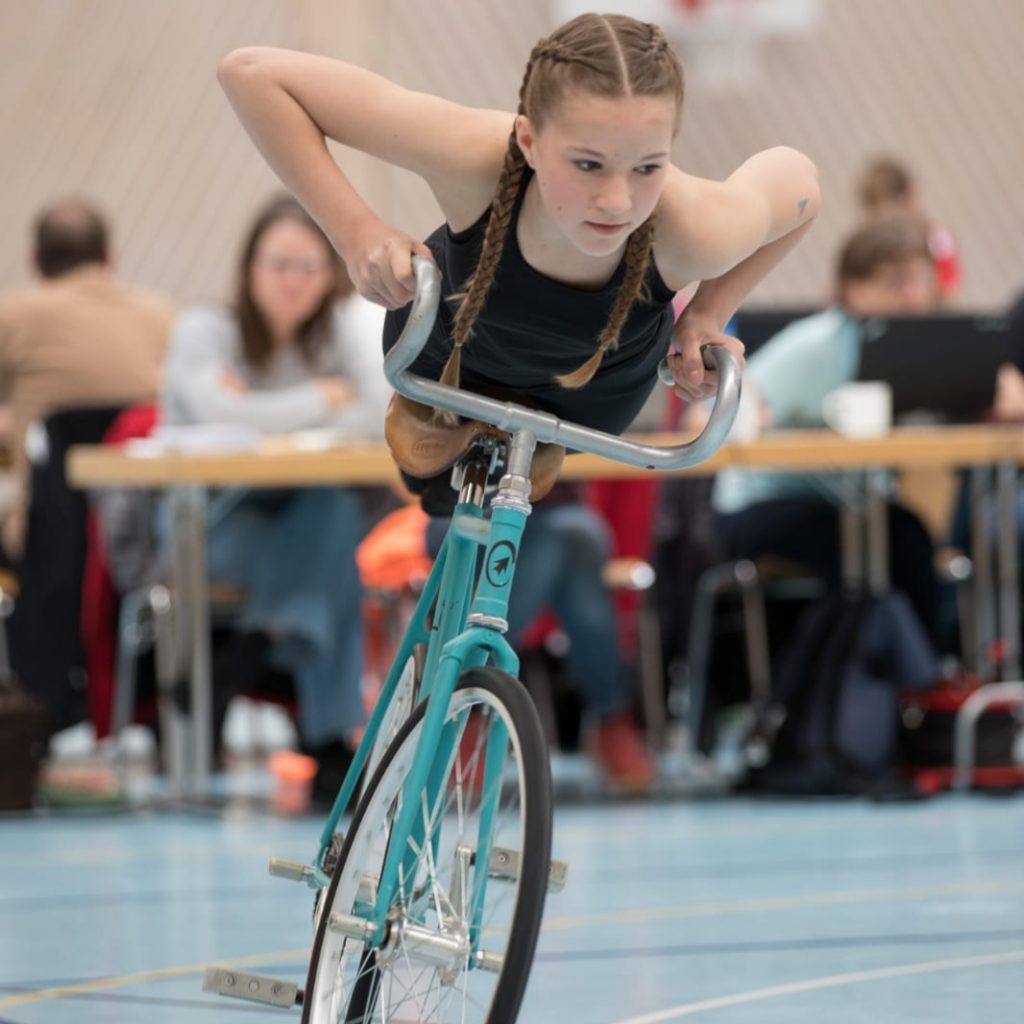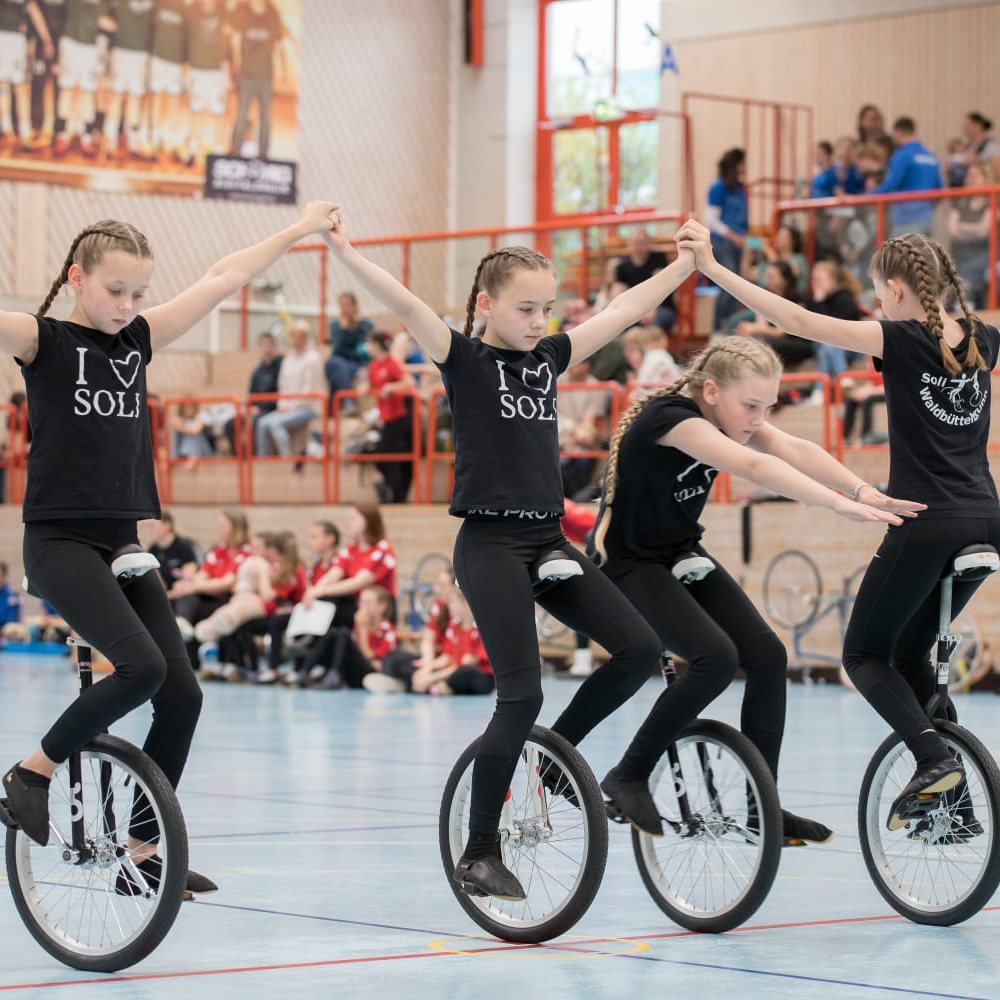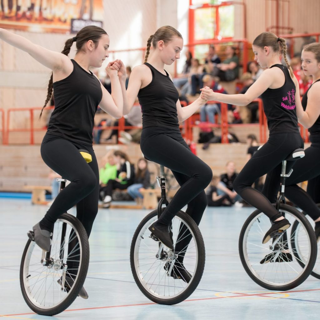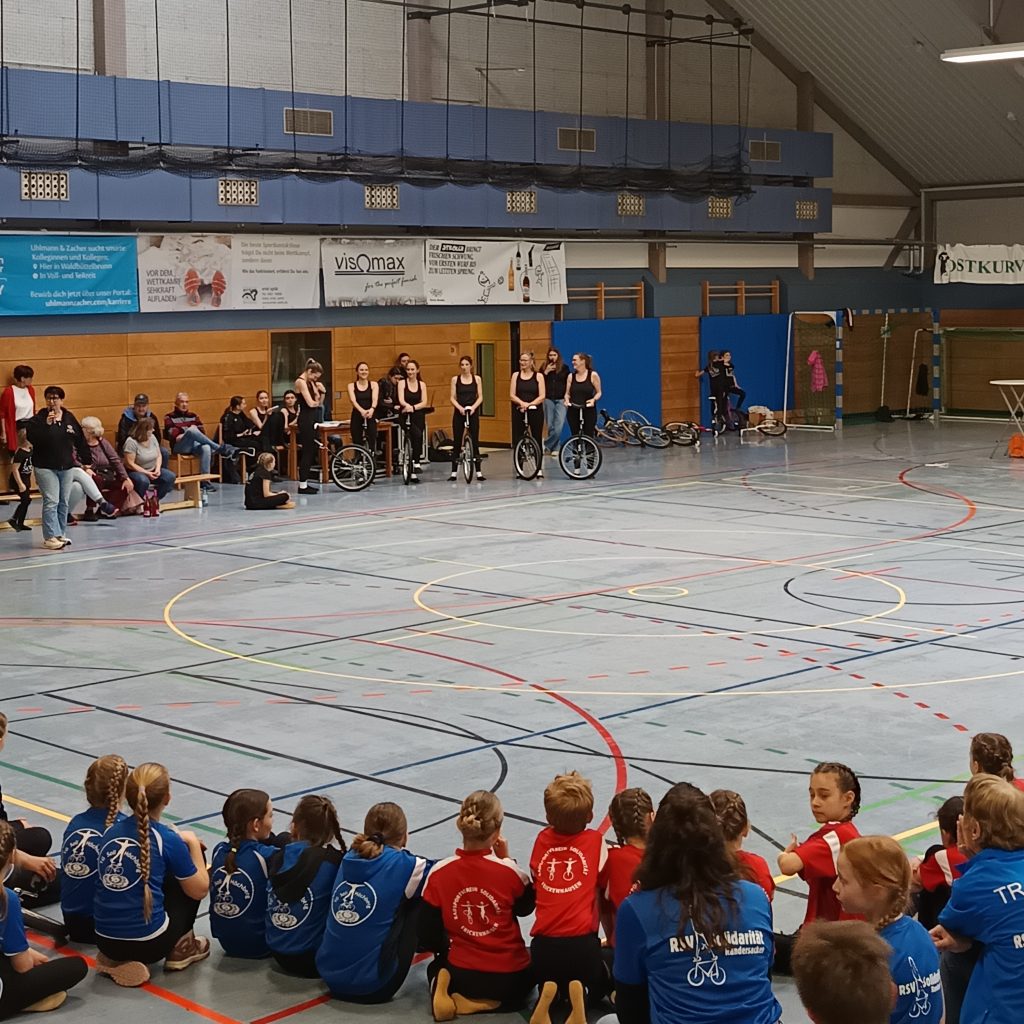 Neben Radball macht das Kunst- und Einradfahren den größten Teil unseres Trainings- und Sportbetriebs aus. Um die 65 Kinder und Jugendliche betreiben diese Sportarten in unserem Verein. Dafür wird aus einem Katalog von Übungen eine Kür zusammengestellt, die die Sportlerinnen wöchentlich zu ihren Trainingszeiten einüben. Bei Wettkämpfen wird diese Kür dann von einer Jury, dem Kampfgericht, bewertet. Bei den Meisterschaften in der Region sind wir immer Viele! Ein großer Dank gilt den Trainerinnen und Allen im Hintergrund, die viel Zeit, Energie und Nerven in unseren Nachwuchs investieren. Ohne Euer Engagement wäre der Sportbetrieb so nicht möglich.