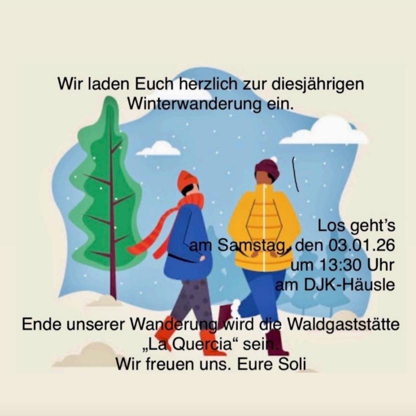 Einladung zur WINTERWANDERUNG am Samstag 3. Januar 2026. Um 13.30 Uhr geht es am DJK-Häusle los. Schlusshock machen wir in der Waldgaststätte „La Quercia“. Wir sehen uns!