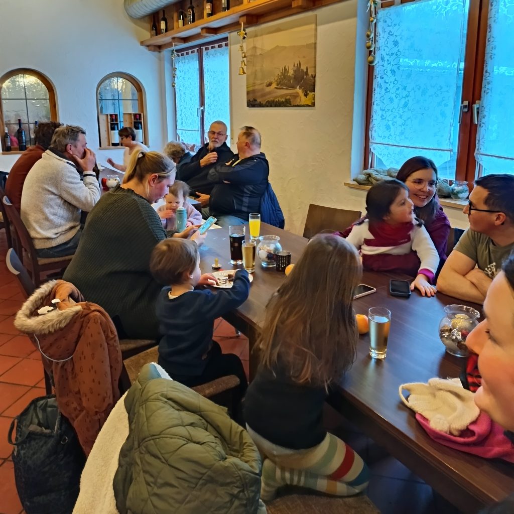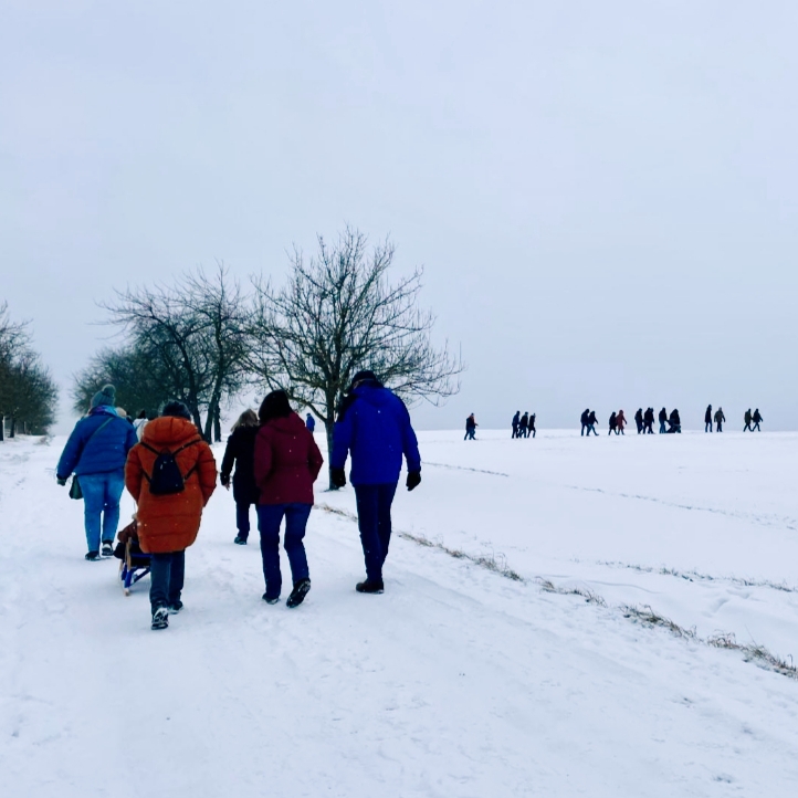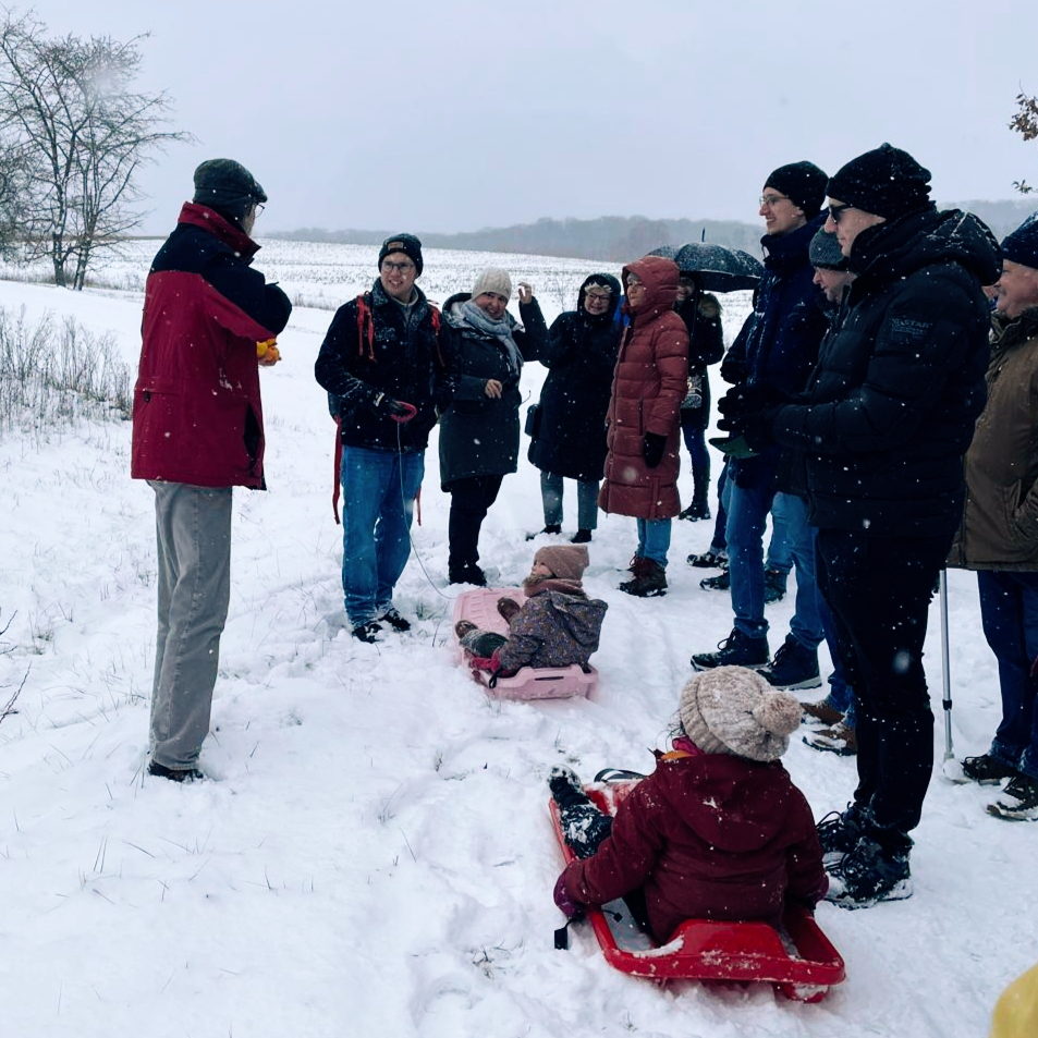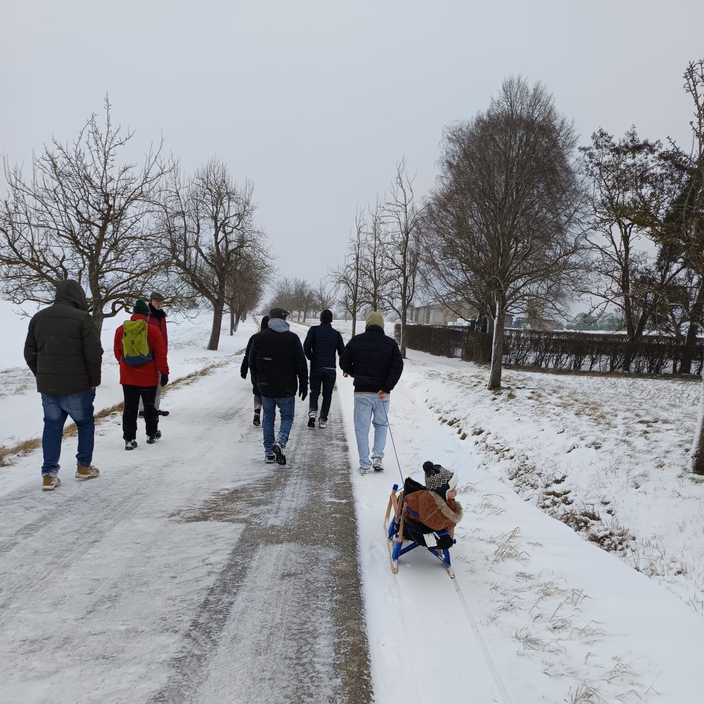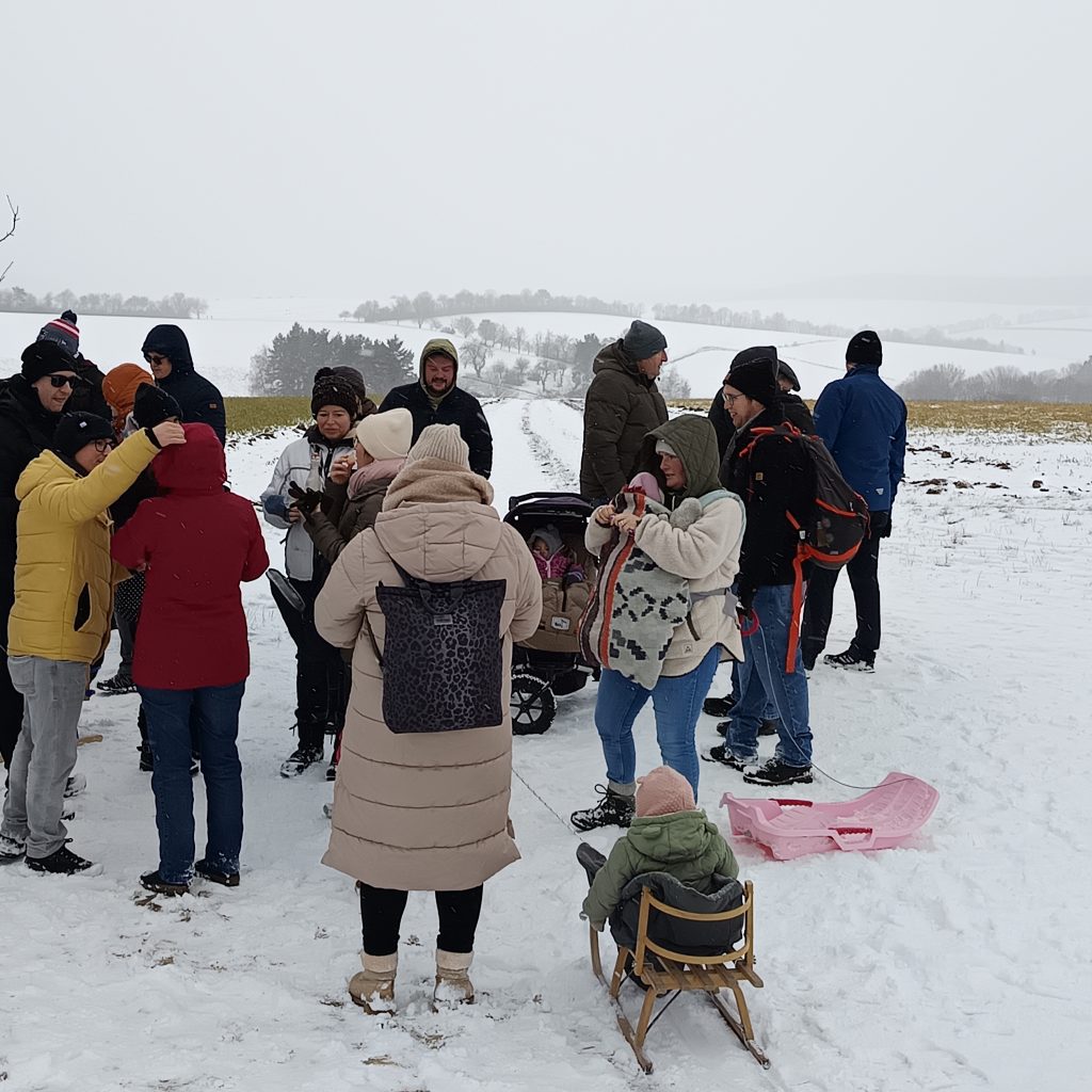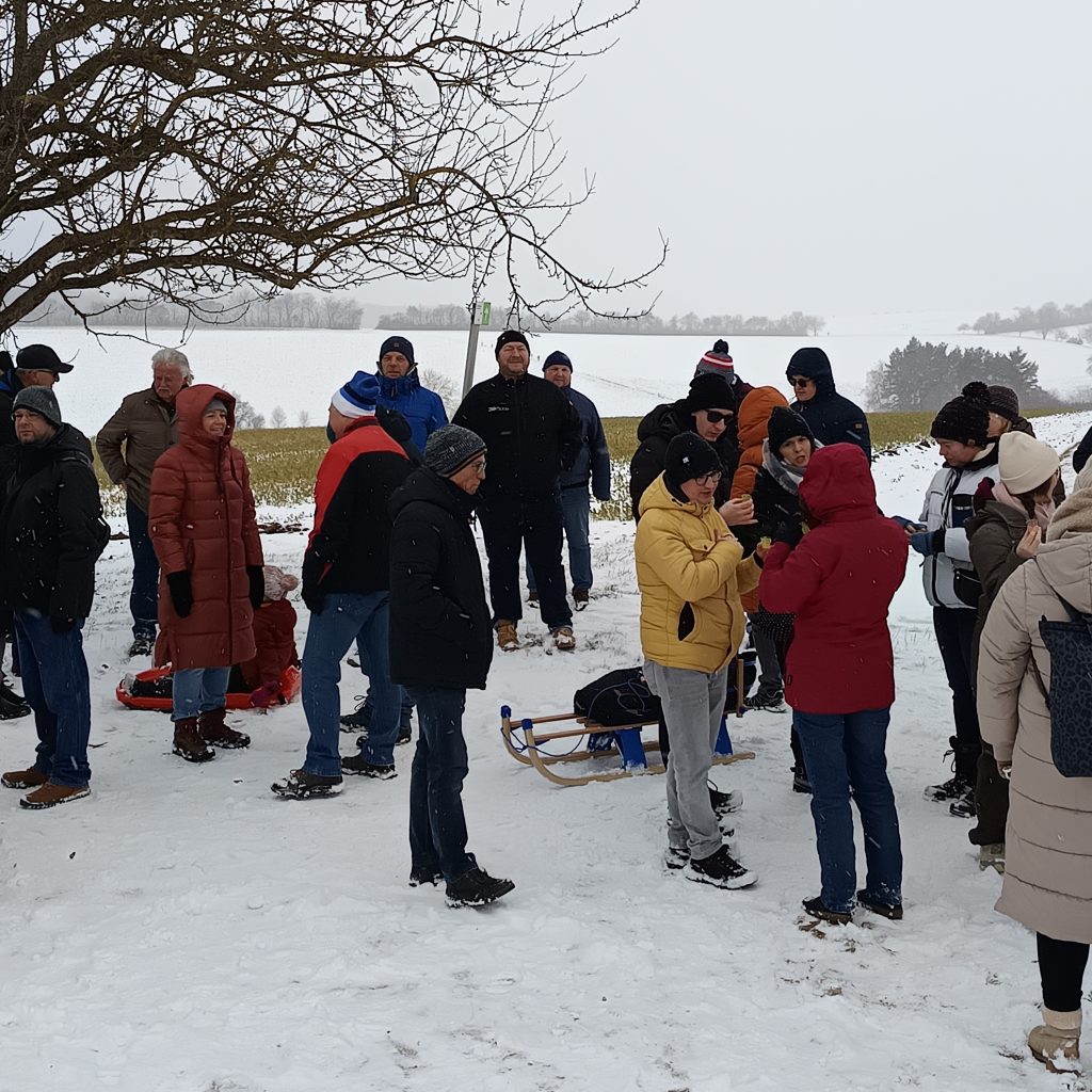 Bei unserer Winterwanderung am 1. Samstag in 2026 waren wir an die 50 Leute – Groß und Klein. Dieses Jahr liefen wir durch die Waldbüttelbrunner Flur. Dadurch waren auch wieder mal einige Familien mit kleinen Kindern dabei. Bei kaltem Winterwetter stapften wir durch den Schnee und konnten die Kinder in ihren Schlitten mitnehmen. Auf den Höhen blies uns der eisige Wind in die Gesichter und wir liefen ein wenig schneller unserem Ziel, der Waldgaststätte, entgegen. Dort wärmten wir uns bei Kaffee, Kuchen und Tiramisu auf. Die Solifamilie saß gemütlich beisammen und stärkte sich mit Pizza und Nudeln. Nach ein paar kühlen Getränken machten sich alle früher oder später wieder auf den Heimweg. Vielen Dank an Massimo und Manuela.
