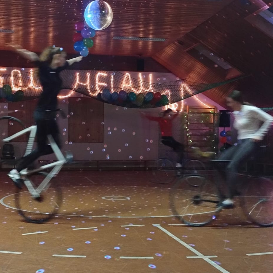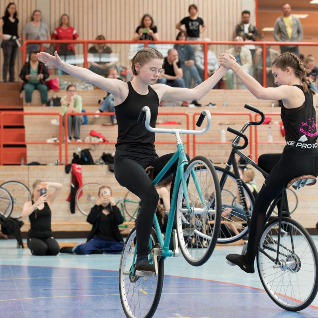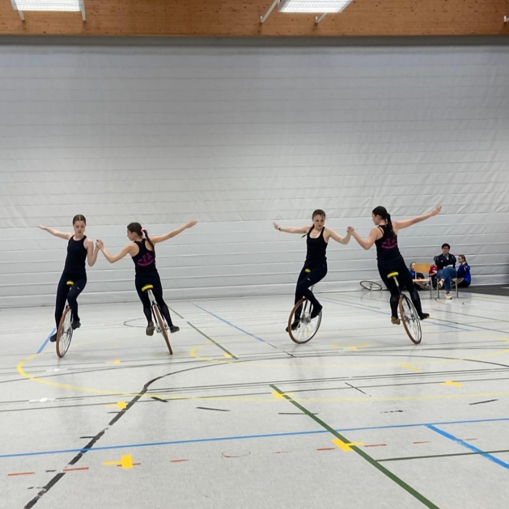 Um 17.00 Uhr, in der Pause zwischen der Vor- und der Finalrunde des Radball-Worldcups, zeigen die Kunst- und Einradfahrerinnen ihr Können!