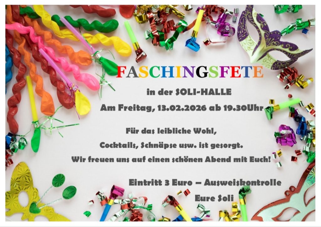 FASCHINGSFETE am Freitag, 13. Februar 2026 um 19.30 Uhr in der SOLI-Halle