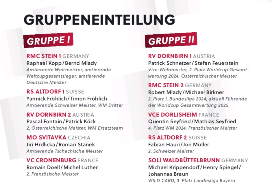 Die Brüder sind in den letzten Jahren das Top Team aus Frankreich. Die Elsässer konnten zahlreiche Erfolge einfahren und sind auf jeden Fall Halbfinalkandidaten beim stark besetzten Weltcup in Waldbüttelbrunn. Bei der letzten WM in Bremen scheiterten sie denkbar knapp im 4-Meterschießen am Team Österreich, sonst wäre sogar der Kampf um Gold und Silber zum Greifen nahe gewesen.