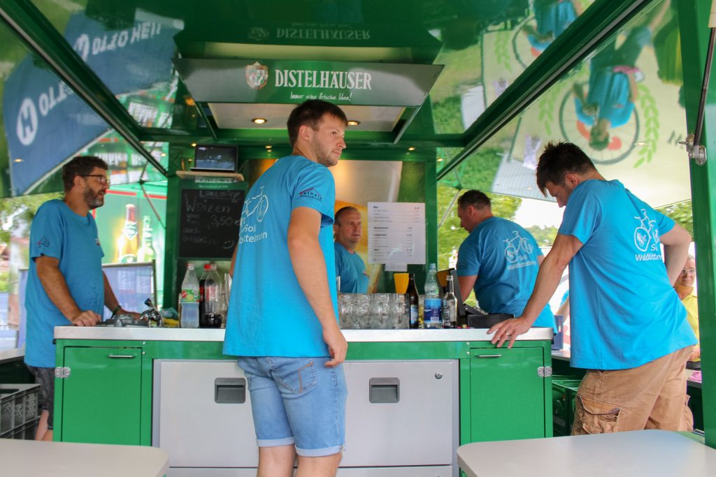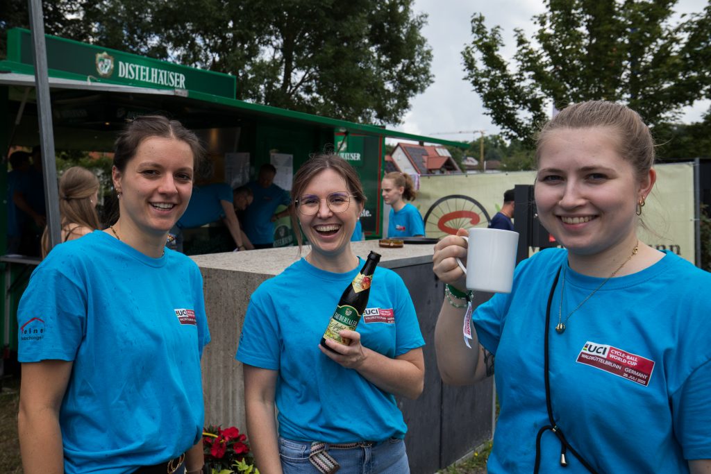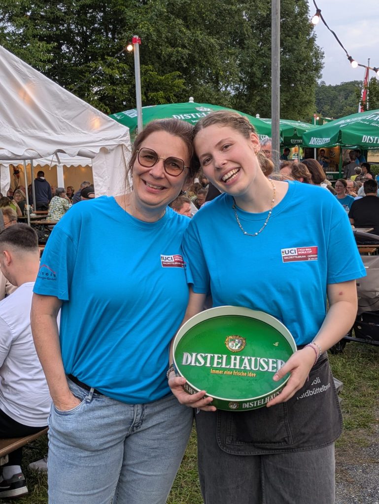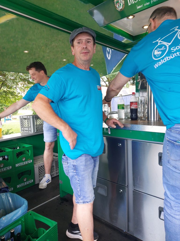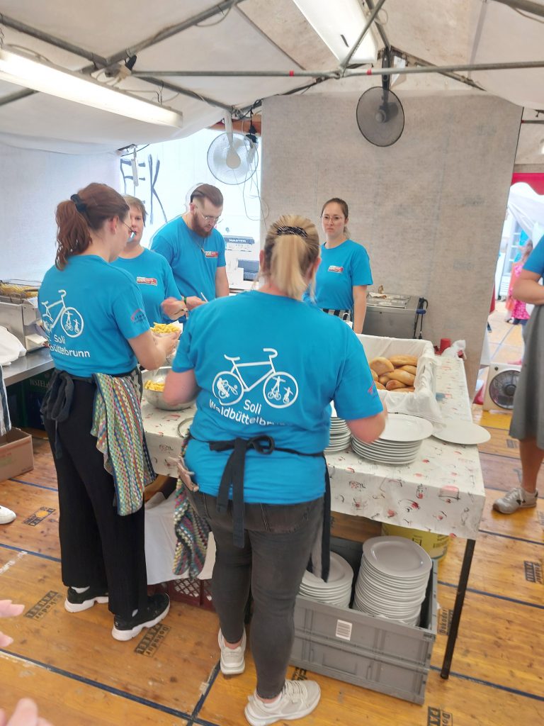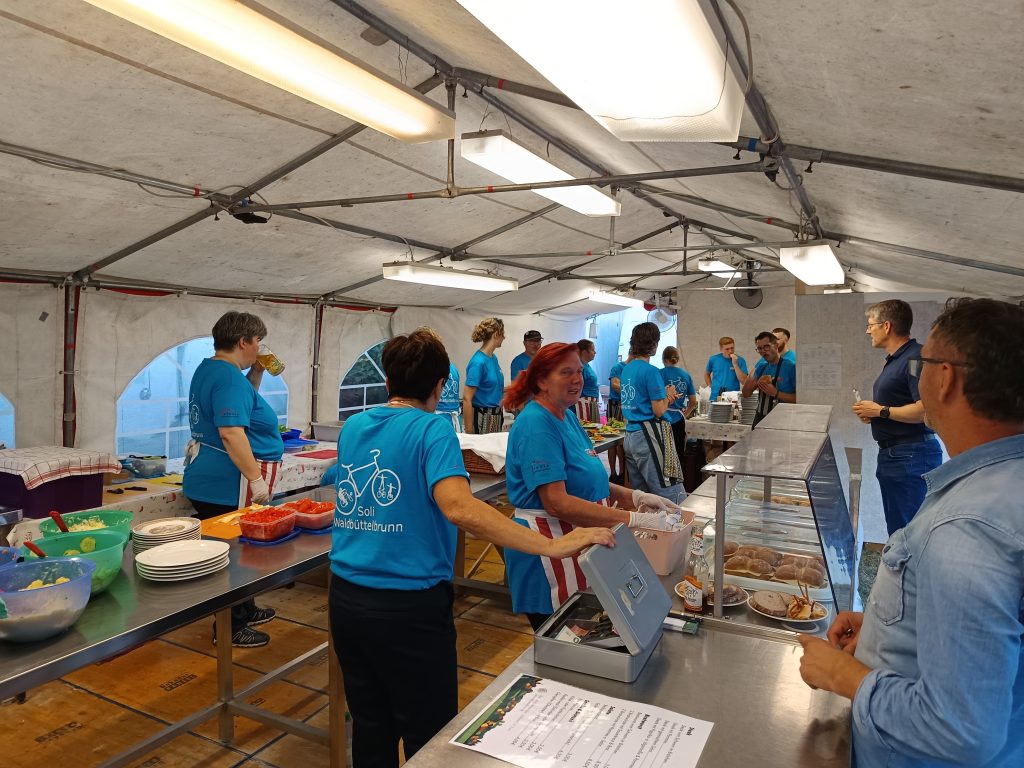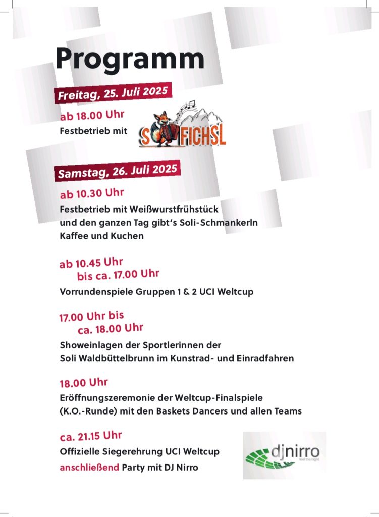 Dass die Soli so ein Ereignis wie den UCI World Cup auch gebührend feiern muss, ist natürlich jedem, der die Soli kennt, klar gewesen. Bereits am Freitag war ein toller Festplatz vor der Halle vorbereitet, und was zuerst kam, war der große Regen… Doch pünktlich zu den ersten Klängen von ‚s‘Fichsl aus dem Ötztal‘ bekamen wir bestes Festwetter und die Besucher strömten zum Festplatz. Bei leckeren Soli-Schmankerln, frisch gezapftem Bier und Cocktails und Wein aus der Soli-Bar konnten sich auch die ersten internationalen Gäste, die bereits angereist waren, ein Bild von der Waldbüttelbrunner Festkultur machen. Es wurde gefeiert und geschlemmt bis tief in die Nacht und s‘Fichsl aus Tirol hat gefühlt mehr Zugaben als Lieder während des eigentlichen Auftritts spielen müssen. Am Samstag startete der Festbetrieb parallel zum Turnier bereits mit einem Weißwurstfrühstück. Der Festplatz füllte sich wieder sehr schnell mit vielen begeisterten Gästen und es herrschte den ganzen Tag über eine tolle Stimmung bei gutem Essen und frischen Getränken. Nur einmal war es auf dem Festplatz ganz ruhig, dann nämlich, als das mit Spannung erwartete World Cup Finale in der Ballsporthalle stieg. Essens- und Getränkestände wurden vorübergehend geschlossen, damit sich auch alle Helfer in der Halle versammeln konnten, um die Sportler anzufeuern. Nach der beeindruckenden Siegerehrung wurde wieder bis spät gefeiert, im Anschluss an das Turnier stieg noch die After Party in der Ballsporthalle. DJ Nirro aus Waldbüttelbrunn hatte sich angekündigt und sorgte bei den Gästen für geniale Partystimmung. Am Sonntag waren bereits ab 8 Uhr, also kurz nach Schließung der Bar, die ersten Helfer vor Ort. Nach nur 6 Stunden inklusive einer ausgiebigen Mittagspause war der Abbau erledigt und die Ballsporthalle nicht mehr Radballhölle, sondern eben wieder Ballsporthalle – eine unglaubliche Leistung von über 60 fleißigen Helferinnen und Helfern!