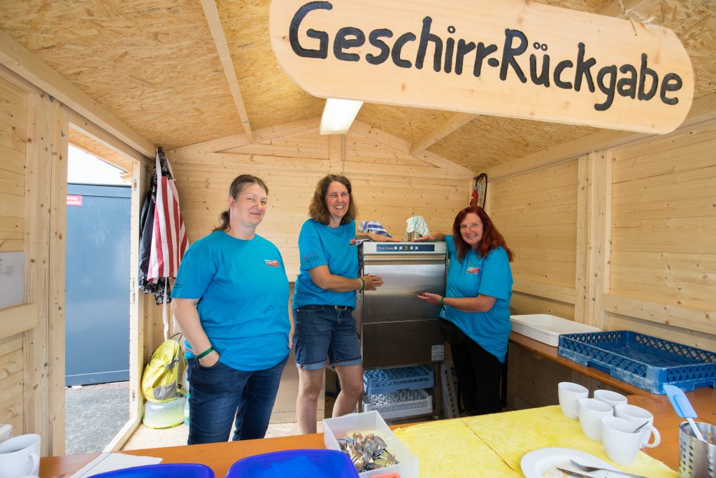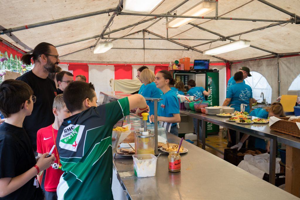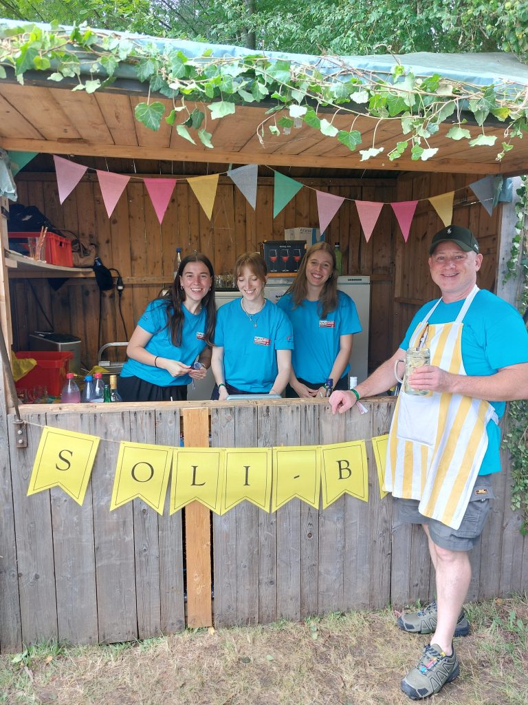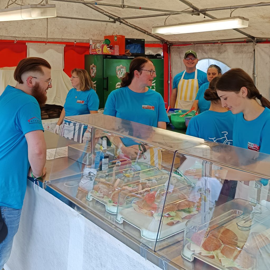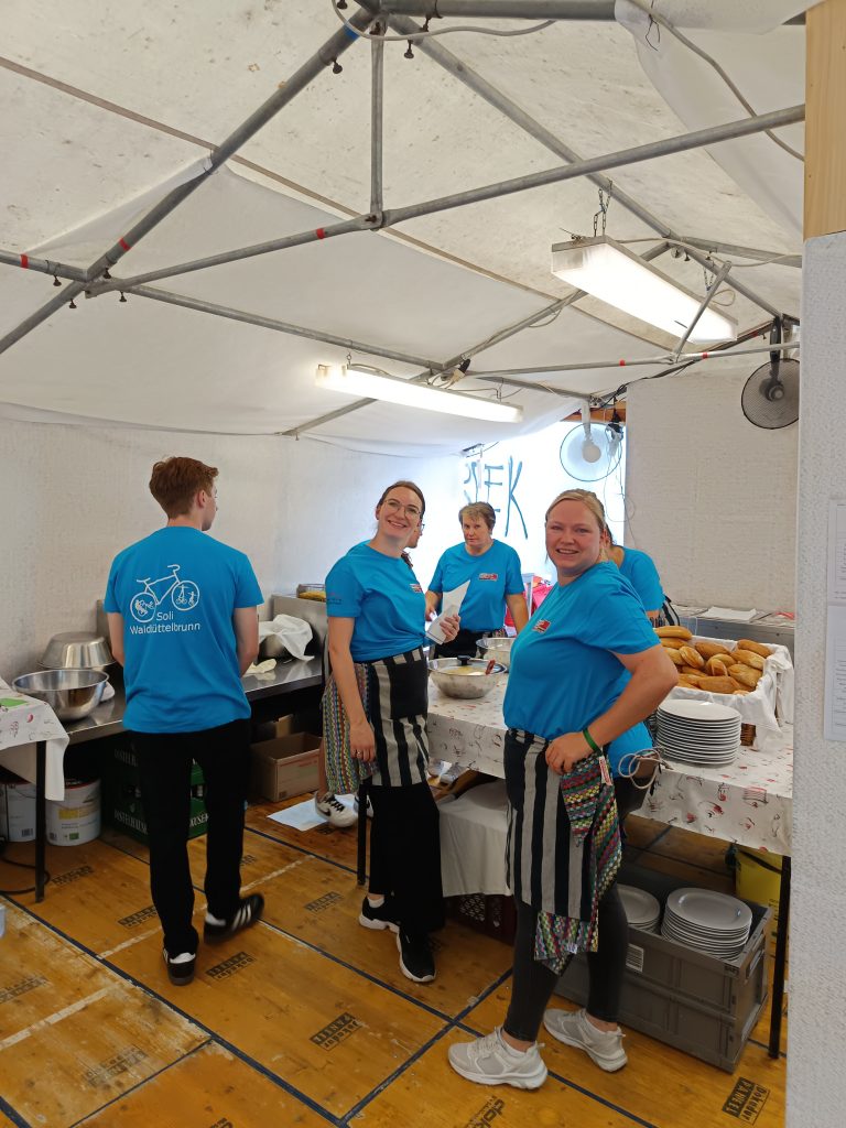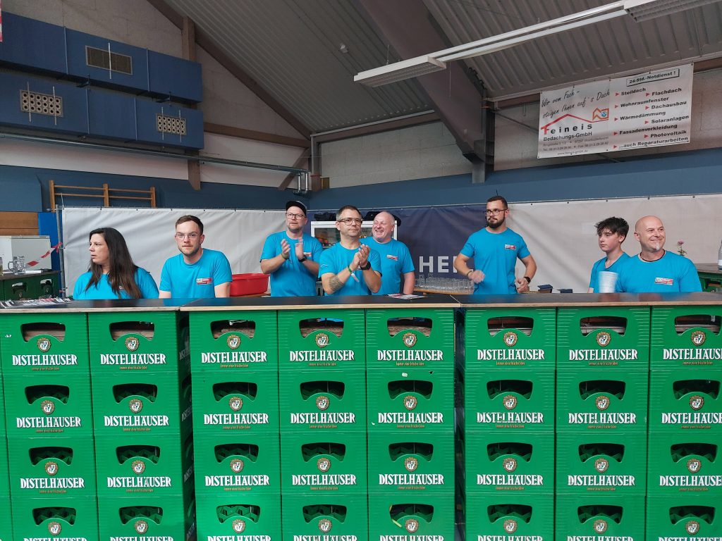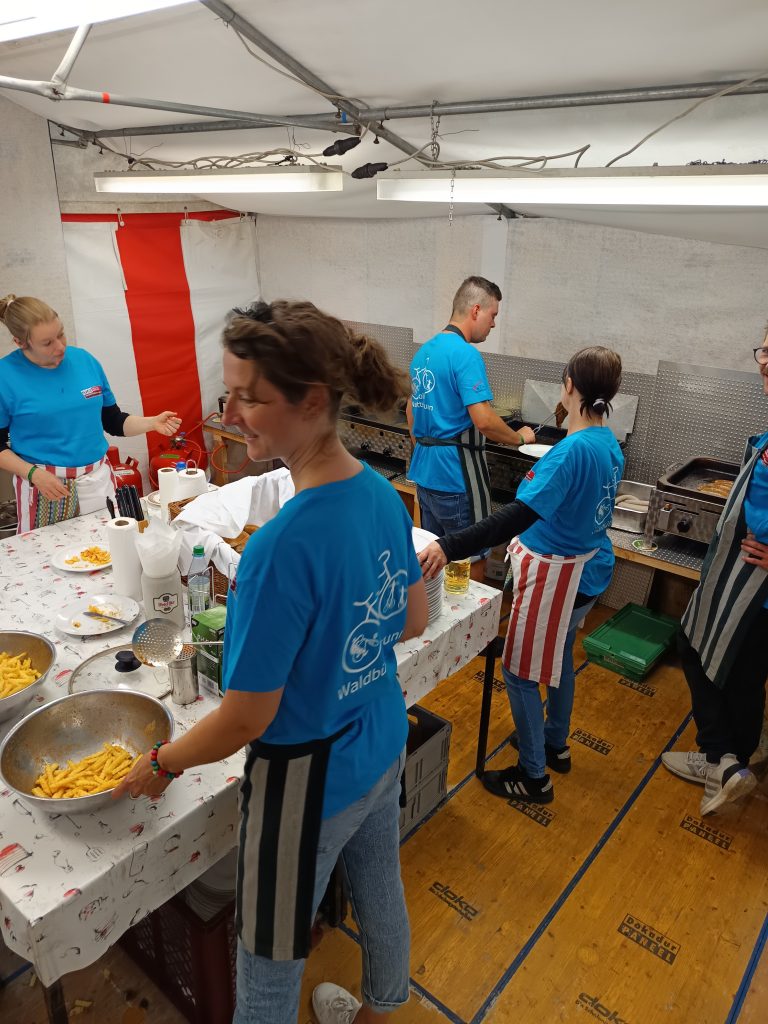 Dass die Soli so ein Ereignis wie den UCI World Cup auch gebührend feiern muss, ist natürlich jedem, der die Soli kennt, klar gewesen. Bereits am Freitag war ein toller Festplatz vor der Halle vorbereitet, und was zuerst kam, war der große Regen… Doch pünktlich zu den ersten Klängen von ‚s‘Fichsl aus dem Ötztal‘ bekamen wir bestes Festwetter und die Besucher strömten zum Festplatz. Bei leckeren Soli-Schmankerln, frisch gezapftem Bier und Cocktails und Wein aus der Soli-Bar konnten sich auch die ersten internationalen Gäste, die bereits angereist waren, ein Bild von der Waldbüttelbrunner Festkultur machen. Es wurde gefeiert und geschlemmt bis tief in die Nacht und s‘Fichsl aus Tirol hat gefühlt mehr Zugaben als Lieder während des eigentlichen Auftritts spielen müssen. Am Samstag startete der Festbetrieb parallel zum Turnier bereits mit einem Weißwurstfrühstück. Der Festplatz füllte sich wieder sehr schnell mit vielen begeisterten Gästen und es herrschte den ganzen Tag über eine tolle Stimmung bei gutem Essen und frischen Getränken. Nur einmal war es auf dem Festplatz ganz ruhig, dann nämlich, als das mit Spannung erwartete World Cup Finale in der Ballsporthalle stieg. Essens- und Getränkestände wurden vorübergehend geschlossen, damit sich auch alle Helfer in der Halle versammeln konnten, um die Sportler anzufeuern. Nach der beeindruckenden Siegerehrung wurde wieder bis spät gefeiert, im Anschluss an das Turnier stieg noch die After Party in der Ballsporthalle. DJ Nirro aus Waldbüttelbrunn hatte sich angekündigt und sorgte bei den Gästen für geniale Partystimmung. Am Sonntag waren bereits ab 8 Uhr, also kurz nach Schließung der Bar, die ersten Helfer vor Ort. Nach nur 6 Stunden inklusive einer ausgiebigen Mittagspause war der Abbau erledigt und die Ballsporthalle nicht mehr Radballhölle, sondern eben wieder Ballsporthalle – eine unglaubliche Leistung von über 60 fleißigen Helferinnen und Helfern!