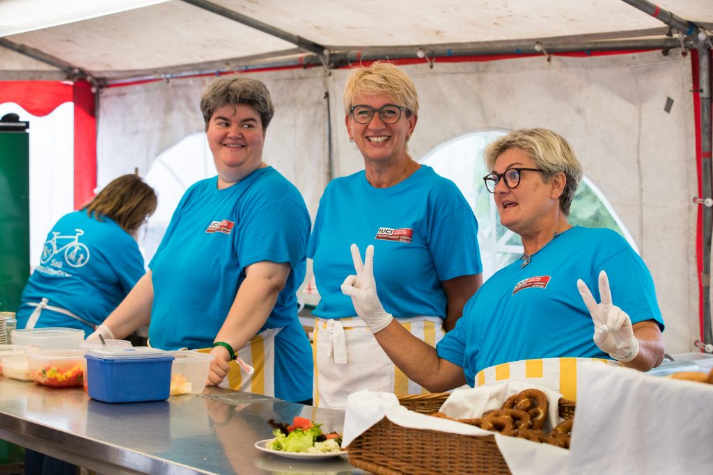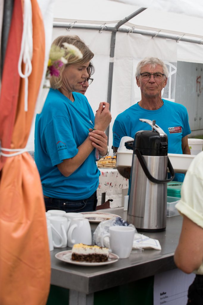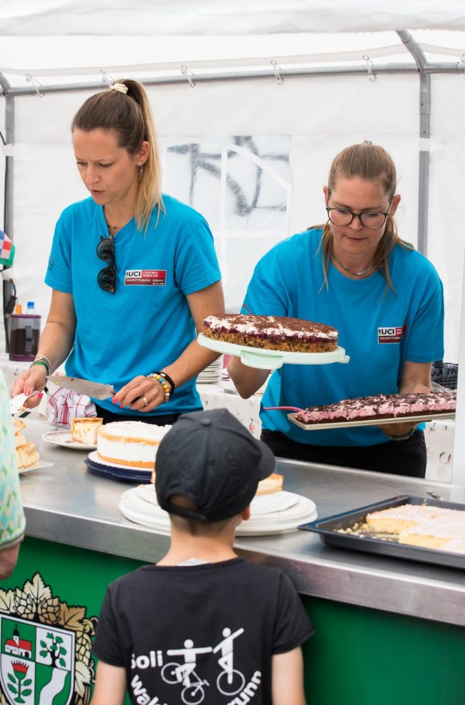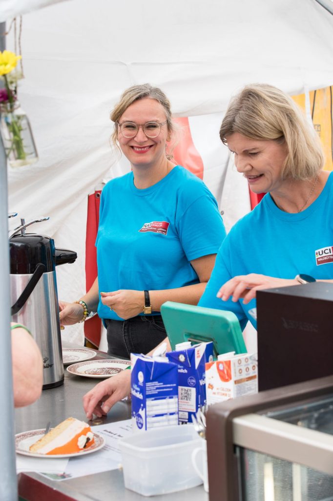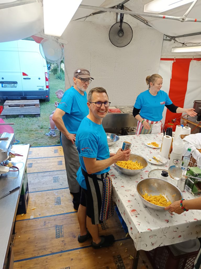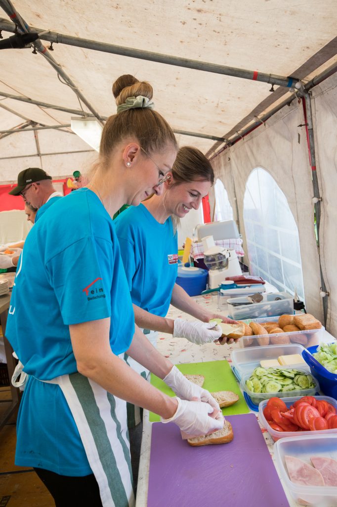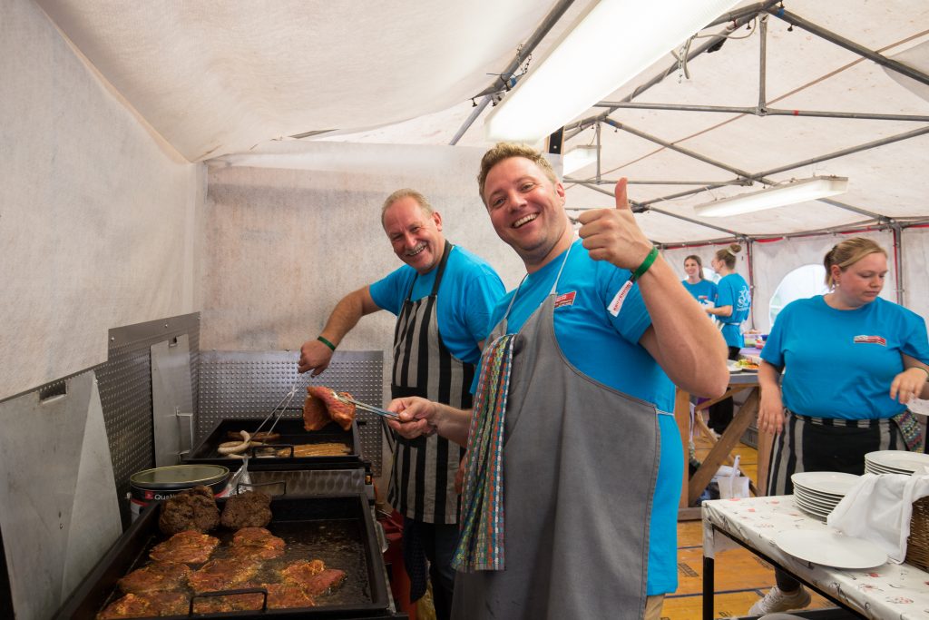 Dass die Soli so ein Ereignis wie den UCI World Cup auch gebührend feiern muss, ist natürlich jedem, der die Soli kennt, klar gewesen. Bereits am Freitag war ein toller Festplatz vor der Halle vorbereitet, und was zuerst kam, war der große Regen… Doch pünktlich zu den ersten Klängen von ‚s‘Fichsl aus dem Ötztal‘ bekamen wir bestes Festwetter und die Besucher strömten zum Festplatz. Bei leckeren Soli-Schmankerln, frisch gezapftem Bier und Cocktails und Wein aus der Soli-Bar konnten sich auch die ersten internationalen Gäste, die bereits angereist waren, ein Bild von der Waldbüttelbrunner Festkultur machen. Es wurde gefeiert und geschlemmt bis tief in die Nacht und s‘Fichsl aus Tirol hat gefühlt mehr Zugaben als Lieder während des eigentlichen Auftritts spielen müssen. Am Samstag startete der Festbetrieb parallel zum Turnier bereits mit einem Weißwurstfrühstück. Der Festplatz füllte sich wieder sehr schnell mit vielen begeisterten Gästen und es herrschte den ganzen Tag über eine tolle Stimmung bei gutem Essen und frischen Getränken. Nur einmal war es auf dem Festplatz ganz ruhig, dann nämlich, als das mit Spannung erwartete World Cup Finale in der Ballsporthalle stieg. Essens- und Getränkestände wurden vorübergehend geschlossen, damit sich auch alle Helfer in der Halle versammeln konnten, um die Sportler anzufeuern. Nach der beeindruckenden Siegerehrung wurde wieder bis spät gefeiert, im Anschluss an das Turnier stieg noch die After Party in der Ballsporthalle. DJ Nirro aus Waldbüttelbrunn hatte sich angekündigt und sorgte bei den Gästen für geniale Partystimmung. Am Sonntag waren bereits ab 8 Uhr, also kurz nach Schließung der Bar, die ersten Helfer vor Ort. Nach nur 6 Stunden inklusive einer ausgiebigen Mittagspause war der Abbau erledigt und die Ballsporthalle nicht mehr Radballhölle, sondern eben wieder Ballsporthalle – eine unglaubliche Leistung von über 60 fleißigen Helferinnen und Helfern!