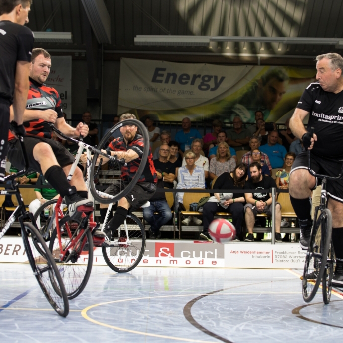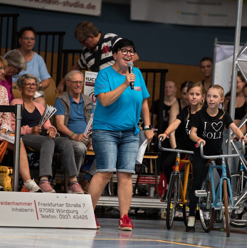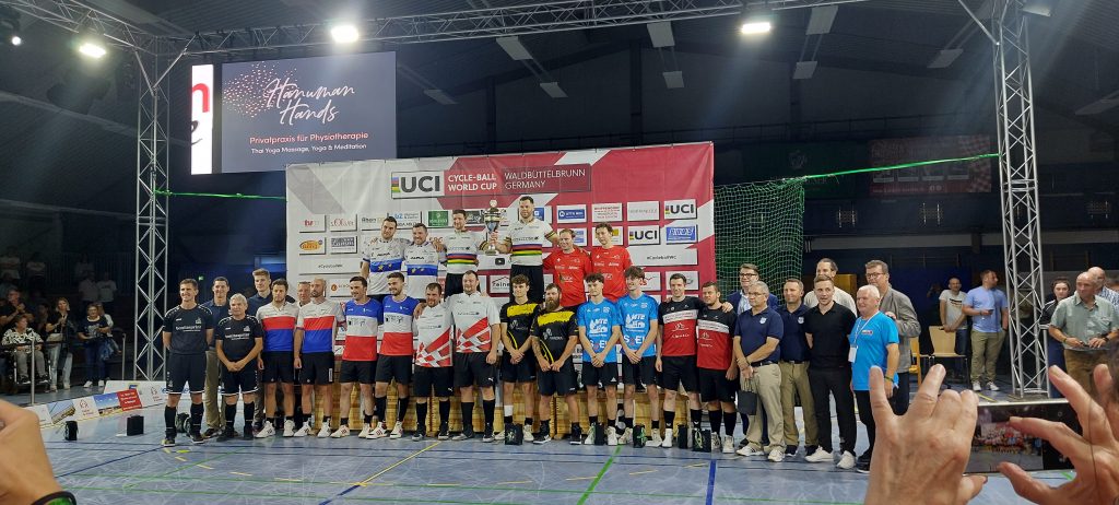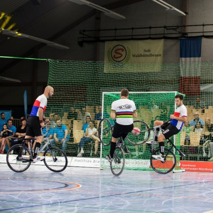 Was kaum jemand für möglich gehalten hat, ist tatsächlich gelungen: Die Soli Waldbüttelbrunn bekam im Sommer des vergangenen Jahres den Zuschlag für das 3. Turnier der World Cup Serie im Radball (nach Baj in Ungarn und Hongkong). Und was war das für ein Turnier: die gesamte Weltspitze des Radballs war in Waldbüttelbrunn versammelt. 10 Teams aus 5 Nationen, darunter die Weltmeister Bernd Mlady und Raphael Kopp aus Stein bei Nürnberg, die aktuellen Europameister aus Dornbirn in Österreich mit dem achtmaligen Weltmeister und Star der Szene Patrick Schnetzer mit seinem Partner Stefan Feuerstein, die WM Dritten und Schweizer Meister aus Altdorf (Yannick und Timon Fröhlich) sowie die Serienmeister aus Frankreich und WM Vierten aus Dorlisheim (Quentin und Matthias Seyfried), um nur die Prominentesten zu nennen. Das Feld startete in zwei 5er Gruppen, um die Halbfinalteilnehmer und die Platzierungsspiele zu ermitteln. Die Ballsporthalle verwandelte sich dank aufwendigster Showtechnik und zweier Zusatztribünen in eine „Radballhölle“ mit über 1.000 Plätzen. Die Stimmung wurde zusätzlich angeheizt durch die beiden Hallensprecher Ralph Gerlich sowie Simon Staffan (bekannt von den Würzburg Baskets sowie Radio Gong) sowie durch die Würzburg Baskets Dancers. Was dabei herauskam war eine absolute Gänsehautatmosphäre, von der man in Waldbüttelbrunn und International noch lange schwärmen wird. Die Halle war ausverkauft und somit war nach der Vorrunde alles angerichtet für die spannende Finalrunde. Im Halbfinale setzte sich der Weltmeister aus Stein deutlich mit 9:2 durch, im zweiten Halbfinale bekamen es die Dornbirner mit den Schweizer Nachwuchsstars aus Altdorf zu tun, die sie in einem spannenden Spiel besiegen konnten. Somit kam es zum Traumfinale zwischen dem Weltmeister und dem Europameister. Der Österreicher Patrick Schnetzer ging leicht geschwächt in die Partie, da er sich nach einem Sturz auf die Schulter im Halbfinale mehrere Minuten behandeln lassen musste. Diese kleine Schwäche nutzten die Weltmeister knallhart aus und besiegten in einem Spiel auf Weltklasseniveau mit 7:3 und nahmen mehr als verdient den Weltpokal mit nach Mittelfranken. Die Gastgeber aus Waldbüttelbrunn durften, mit einer Wild Card als Ausrichter ausgestattet, in der Vorrundengruppe 2 an den Start gehen – ein echtes Erlebnis für die drei Routiniers Henry Spiegel, Michael Krippendorf und Johannes Braun, die in wechselnden Besetzungen antraten. In 5 Spielen gelangen ihnen immerhin 9 Tore und teilweise konnte wirklich gut mitgehalten werden. Die beste Leistung konnten sie gegen Altdorf 2, den Schweizer Vizemeister, abrufen. Hier stand es bis weit in die 2. Halbzeit hinein 2:2, bevor die starken Schweizer dann doch noch den Sieg klarmachten. Die Halle kochte bei den Auftritten des Heimteams fast über, da hat Waldbüttelbrunn gezeigt, was es kann. Der UCI Weltverband, der ja auch Ausrichter der Tour de France etc. ist, zeigte sich in Person vom technischen Delegierten Pierre Klinger sichtlich begeistert: „Das war mit das Beste, was ich bisher außer bei einer Weltmeisterschaft im internationalen Radball gesehen habe: Organisation, Stimmung, Zuspruch – alles auf WM Niveau. Waldbüttelbrunn – jederzeit gerne wieder!“ Auch von den Spielern, die ja eigentlich einiges gewohnt sind, erreichten die Macher der Soli noch zahlreiche Dankesmails und Nachrichten. Waldbüttelbrunn ist seit diesem Sommer im Weltradsport bekannt. Besonders viel Lob der Zuschauer bekam auch die Einlage von ca. 40 Kunst- und Einradmädels der Soli, die ihren Auftritt in dieser tollen Arena sichtlich genossen. Die Zuschauer waren absolut aus dem Häuschen ob der Darbietungen. Auch eine Art Weltpremiere hatten die jungen Sportler auf Lager: die erste 12er Einradkür der Geschichte – ein toller Moment für alle – Sportler und Zuschauer!